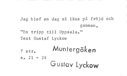 //// Jag blef en dag så läns på fröjd och //// gamman //// "En tripp till Uppsala." //// Text Gustaf Lyckow //// 7 str. Muntergöken //// s. 21 - 24 //// Gustav lyckoyr ////