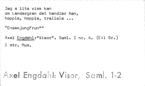 //// Jag e lita visa kan //// om Landergren det handlar han, hoppla, hoppla, trallala //// "Ensamjungfrun" //// Axel Engdahl:"Visor". Saml. I nr. 4. (E:1 Br.) 1 str. Mus. //// Axel Engdahl: Visor, Sam . 1 -2 ////