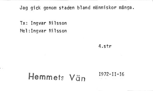 //// Jag gick genom staden bland människor många. //// Tx: Ingvar Nilsson //// biel :Ingvar Nilsson //// 4.str //// 1-lemmets Vän 1972-11-16 ////