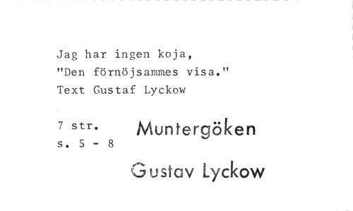 //// Jag har ingen koja, //// "Den förnöjsammes visa." Text Gustaf Lyckow //// 7 str. Muntergöken //// s. 5 - 8 //// Gustav lyckow ////