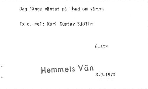//// Jag länge väntat på bud om våren. //// Tx o. mel: Karl Gustav Sjölin //// 6.str //// Hemmets Vän 3.9.1970 ////