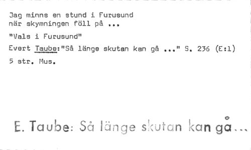 //// Jag minns en stund i Furusund när skymningen föll på //// "Vals i Furusund" //// Evert Taube:"Så länge skutan kan gå ..." S. 236 (E:1) 5 str. Mus. //// 0 //// E. Taube: Sa länge sutan kan go... ////