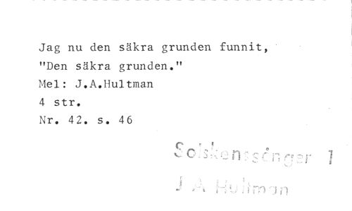 //// Jag nu den säkra grunden funnit, "Den säkra grunden." //// Mel: J.A.Hultman //// 4 str. //// Nr. 42. s. 46 //// 1 //// gi //// g ////