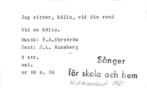 //// Jag sitter, källa, vid din rand Vid en källa. //// Musik: F.A.Ehrström //// Text: J.L. Runeberg //// 4 str. Sån ger //// mel. för skola och hem //// nr 68 s. 36 /•/a»Mlb)'64e1 ////