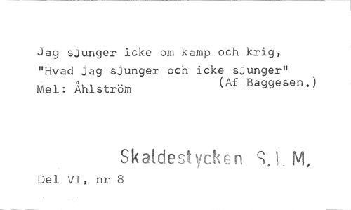 //// Jag sjunger icke om kamp och krig, //// "livad jag sjunger och icke sjunger" Mel: Åhlström (Af Baggesen.) //// Skaldesh M, //// Del VI, nr 8 ////