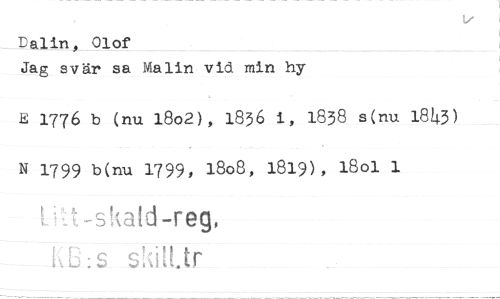 //// Dalin, Olof //// Jag svär sa Malin vid min hy //// E 1776 b (nu 18o2), 1836 i, 1838 s(nu 1843) N 1799 b(nu 1799, 18o8, 1819), 1801 1 //// -'',3Ed rea //// s:d[Ltr ////