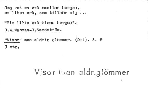 //// Jag vet en vrå emellan bergen, //// en liten vrå, som tillhör mig ... //// "Min lilla vrå bland bergen". J.A.Wadman-J.Sandström. //// "Visor" man aldrig glömmer. (0:1). S. 8 3 str. //// Visor Illan Jldr.j!ömmer ////