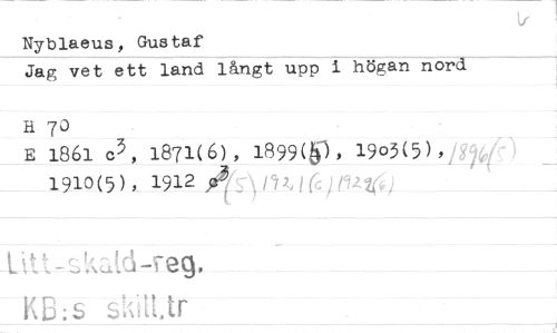 //// Nyblaeus, Gustaf //// Jag vet ett land långt upp i högan nord //// H 70 1871(6), 1899(6), 19o3(5), //// E 1861 c3, 1912 3t31 )n246)/9246) //// 1910(5), //// -l-t- t-kaid Feg. //// KB:s skilt tr ////