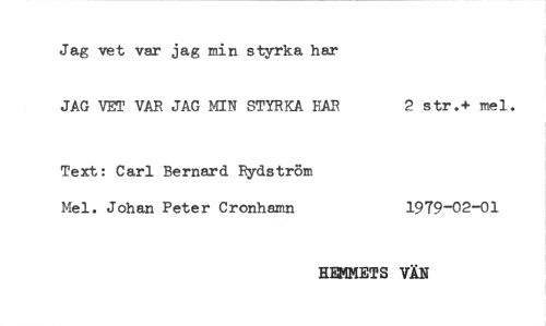 //// Jag vet var jag min styrka har //// JAG VET VAR JAG MIN STYRKA HAR 2 str.+ mel. //// Text: Carl Bernard Rydström //// Mel. Johan Peter Cronhamn 1979-02-01 //// HEMMETS VÄN ////