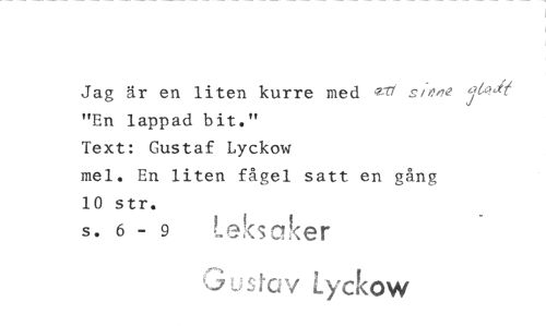 //// Jag är en liten kurre med el- since "En lappad bit." a tadt //// Text: Gustaf Lyckow //// mel. En liten fågel satt en gång 10 str. //// s. 6 - 9 leksaker //// Gustav Lyckow ////