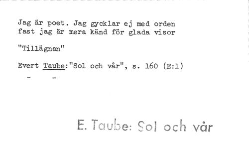 //// Jag är poet. Jag gycklar ej med orden //// fast jag är mera känd för glada visor //// "Tillägnan" //// Evert Taube:"Sol och vår", s. 160 (E:1) //// E. Taube: Sol och vår ////