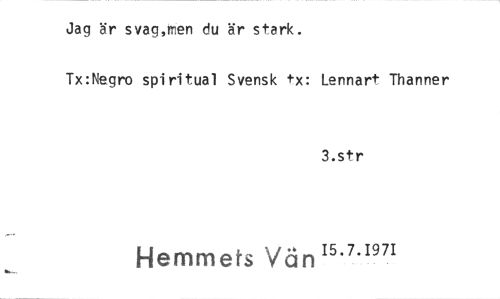 //// Jag är svagoien du är stark. //// Tx :Negro spi ri tual Svensk tx: Lennart Thanner //// 3.str //// Hemmets ya n 15.7.1971 ////