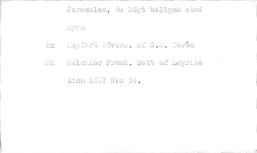 //// jerusalemy du högt belägna stad Ar,:n //// Tx i_eyfart öfVere. af C.. or4n kelcLior Frank. Satt af Layritz Zion 183-7 N:o 34. ////