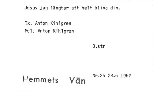 //// Jesus jag längtar att helt bliva din. //// Tx. Anton Kihlgren Mel. Anton Kihlgren //// 3.str //// Pemmets Vän Nr.26 28.6 1962 ////