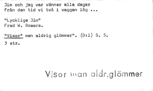 //// 3im och jag var vänner alla dagar från den tid vi två i vaggan låg ... //// "Lycklige Jim" Fred W. Bowers. //// "Visor" man aldrig glömmer". (D:1) S. 5. 3 str. //// Visor Itvan aickgiömmer ////