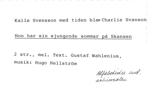 //// Kalle Svensson med tiden blev Charlie Svanson Hon har sin sjungande sommar på Skansen //// 2 str., mel. Text. Gustaf Wahlenius, musik: Hugo Hellström //// 496m45:40- ////