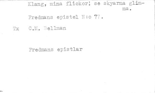 //// Klang, mina flickor! se skyarna glim- //// ma. //// Fredmans epistel U:o 77. Tx C.M. Bellman //// Fredmans epistlar ////