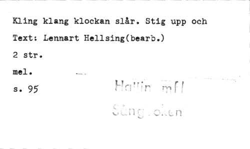 //// Kling klang klockan slår. Stig upp och Text: Lennart Hellsing(bearb.) //// 2 str. //// mel. //// s. 95 ////