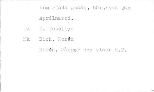 //// Kom glada gosse, hör,hvad jag //// Aprilnarri. Tx Z. Topelivs lik Ric4. Nordn //// Norén, Sånger och visor H.2. ////