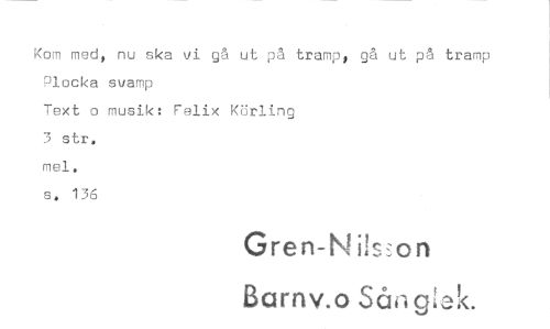 //// Kom med, nu ska vi gå ut på tramp, gå ut på tramp Plocka svamp //// Text o musik: Felix Körling //// 3 str. //// mel. //// s. 136 //// Gren-Nils on //// Barnv.o Sån Biek. ////