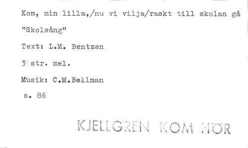 //// Kom, min lilla,/nu vi vilja/raskt till skolan gå "Skolsång" //// Text: L.M. Bentzen 3 str. mel. //// Musik: C.M.Bellman s. 86 ////