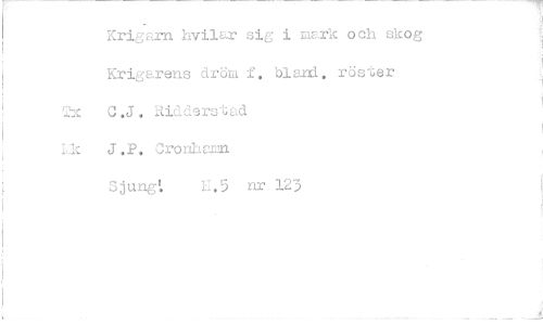 //// Krigarn hvilar sig i mark och skog Krigarens dröm f. bland. röster //// 2x C.J. Ridderstad //// 12k J.P. ronhvmn //// Sjung. 1:.5 nr 123 ////