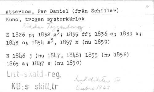//// Atterbom, Per Daniel (från Schiller) Kuno, trogen systerkärlek //// E 1826 p; 1832 g3; 1835 ff; 1836 e; 1839 k; 1843 0; 1854 s3, 1857 x (nu 1859) //// N 1846 j (nu 1847, 1848) 1855 (nu 1856) 18 65 a; 1847 e (nu 1850) //// KB:s ////