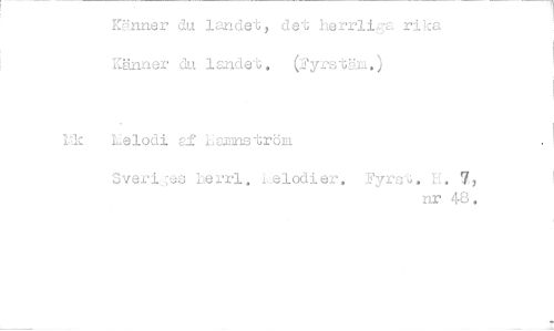 //// nnner du landet, det herrlica rika Känner du landet. (yrstäm.) //// kik Melodi af Monnström //// Sven :s herrl. ,elodier. Fyr. H. 7, //// nr 48. ////