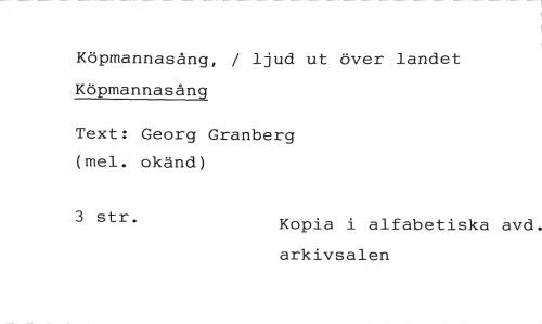 //// Köpmannasång, / ljud ut över landet Köpmannasång //// Text: Georg Granberg (mel. okänd) //// 3 str. Kopia i alfabetiska avd. //// arkivsalen ////