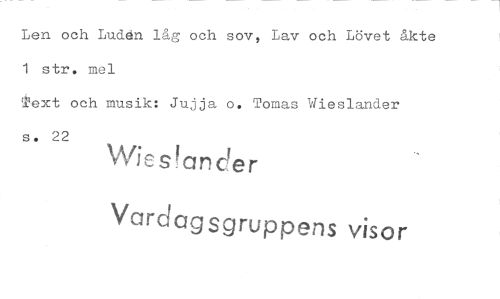 //// Len och Luden låg och sov, Lav och Lövet åkte //// 1 str. mel //// Text och musik: Jujja o. Tomas Wieslander //// s. 22 Wis!ander Vardagsgruppens visor ////