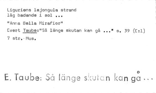 //// Liguriens lejongula strand låg badande i sol •.. .11118M se 39 (E:1) //// "Anna Bella Mirafior" //// Evert Taube:"Så långe skutan kan gå 7 str.,Mus. //// 0 //// E. Taube: Så länge s:z: Kan ga i.. ////