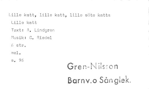 //// Lille katt, lille katt, lille söte katta Lille katt //// Text: A. Lindgren //// Musik: G. Riedel //// 6 str, mel. //// s„ 96 //// Gre n-N ils2on //// Barnv o Sån giek. ////