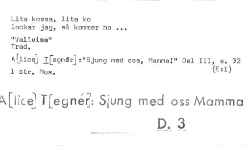 //// Lita kossa, lita ko //// lockar jag, så kommer ho //// "Vallvisa" //// Trad. //// T[egnåri:"Sjung med oss, Mamma!" Del III, s. 32 //// (E:1) //// 1 str. Mus. //// k[ike 1-Legn6) Siung med oss Mamma //// D. 3 ////