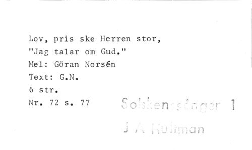 //// Lov, pris ske Herren stor, "Jag talar om Gud." //// Mel: Göran Norsen //// Text: G.N. //// 6 str. //// Nr. 72 s. 77 n //// U j n ////