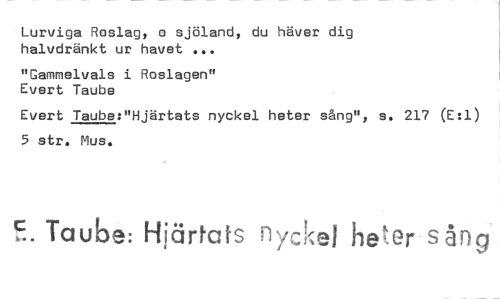 //// Lurviga Raslag, o sjöland, du häver dig halvdränkt ur havet ... //// "Gammelvals i Roslagen" Evert Taube //// Evert Taube:"Hjärtats nyckel heter sång", s. 217 (E:1) 5 str. Mus. //// Taube: Hjärtats nyckel heder sång ////
