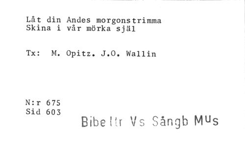 //// Låt din Andes morgonstrimma Skina i vår mörka själ //// Tx: M. Opitz. J.O. Wallin //// N:r 675 //// Sid 603 Bibeltr Vs Sångb Mus ////