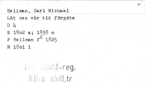 //// Bellman, Carl Michael Låt oss vår tid förgäta //// D 4 //// E 18o2 a; 1838 n F Bellman f2 1825 //// N 18o1 i //// Kb:s ////