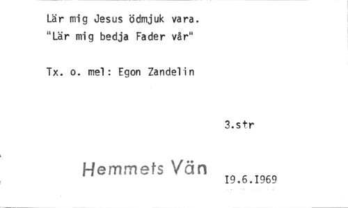 //// Lär mig Jesus ödmjuk vara. "Lär mig bedja Fader vår" //// Tx. o. mel: Egon Zandelin //// 3.stt- //// Hemmets Vän 19.6.1969 ////