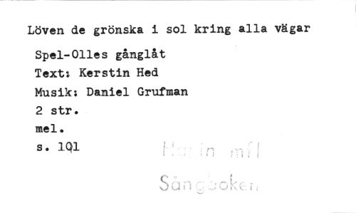 //// Löven de grönska i sol kring alla vägar //// Spel-011es gånglåt Textt Kerstin Hed //// Musik: Daniel Grufman 2 str. //// mel. //// s. 1Q1 //// I ////