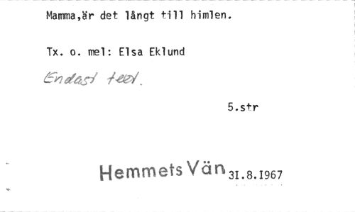 //// Mamma,är det långt till himlen. //// Tx. o. mel: Elsa Eklund //// 5 al45,1 71-4W //// 5.str //// Hemmets Vän31.8.1967 ////