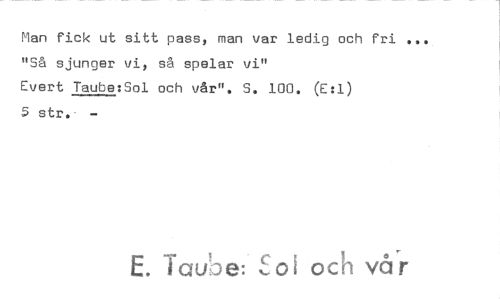 //// Man fick ut sitt pass, man var ledig och fri ... "Så sjunger vi, så spelar vi" //// Evert Taube:Sol och vår". S. 100. (E:1) //// 5 str.- - //// E. Ta(1)e: L'ol och vår ////