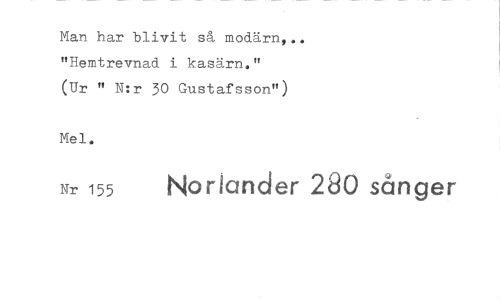//// Man har blivit så modärn,.. "Hemtrevnad i kasärn." //// (Ur " N:r 30 Gustafsson") //// Mel. //// Nr 155 Noriander 280 sånger ////