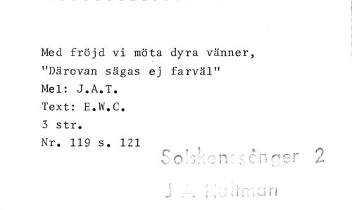 //// Med fröjd vi möta dyra vänner, "Därovan sägas ej farväl" //// Mel: J.A.T. //// Text: E.W.C. //// 3 str. //// Nr. 119 s. 121 //// a n ////