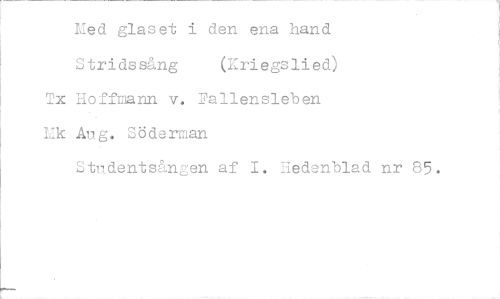 //// Med glaset i den ena hand //// Stridssång (Kriegslied) //// Tx Hoffmann v. Fallensleben //// Uk Aug. Söderman //// Studentsången af I. Hedenblad nr 85. ////