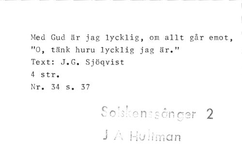 //// Med Gud är jag lycklig, om allt går emot, "0, tänk huru lycklig jag är." //// Text: J.G. Sjöqvist //// 4 str. //// Nr. 34 s. 37 //// o a n - (:°- r r 2 //// i I Ti a n ////
