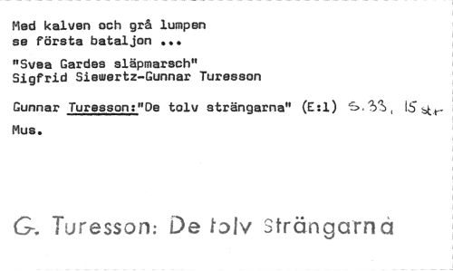 //// Med kalven och grå lumpen se första bataljon //// "Svea Gardes släpmarsch" //// Sigfrid Siewertz-Gunnar Turesson //// Gunnar Turesson:"De tolv strängarna" (E:1) 5.?).1, Mus. //// G-, Turesson: De talv strängarnd ////