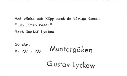 //// Med väska och käpp samt de öfriga donen " En liten resa." //// Text Gustaf Lyckow //// 16 str. //// Munteraöken //// s. 237 239 //// uusfav Lyckow ////