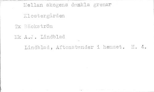 //// Mellan skogens dnnkla grenar Illostergärden //// Tx Bäckström //// Mk A.J. Lindblad //// Lindblad, Aftonstnnder i hemmet. II. 4. ////