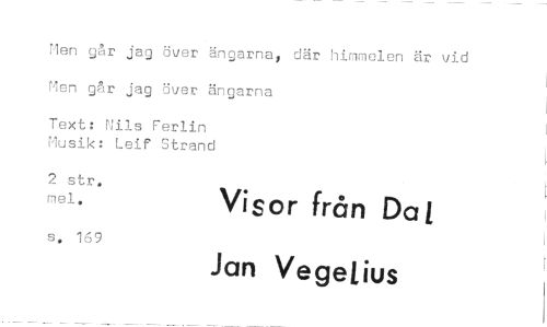 //// Men går jag över ängarna, där himmelen är vid Men går jag över ängarna //// Text: Nils Ferlin Musik: Leif Strand //// 2 str. mei. Visor från Dal //// s. 169 Jan Vegelius ////