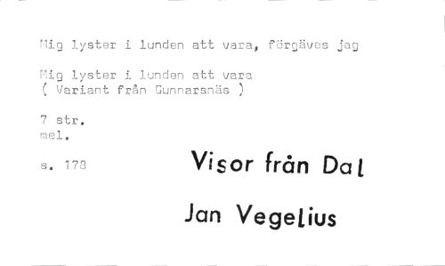 //// Mig lyster i lunden att vara, förgäves ia9 //// Mig lyster i lunden att vara ( Variant från Gunnarsnäs ) //// 7 str. mel. //// s. 173 Visor från Dal //// Jan Vegehus ////